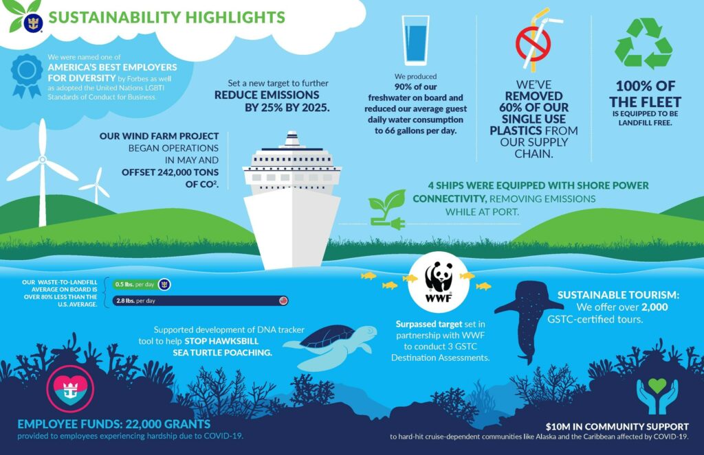 Lodné spoločnosti CLIA sa v decembri 2018 zaviazali v rámci celej flotily znížiť do roku 2030 mieru emisií uhlíka o 40 % v porovnaní s úrovňami v roku 2008. Priemysel výletných lodí na celom svete usilovne pracuje na dosiahnutí tohto agresívneho cieľa.