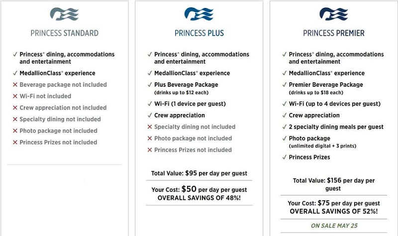 • Princess Plus (cena $50 na osobu a deň, od 25.5.2022) – zahrŕňa neobmedzenú WiFi pre 1 zariadenie; nápojový balíček Plus Beverage package (s nápojmi  v hodnote $12, zľavu 25 % na fľaškové vína, kávové nápoje, smoothies a minerálka); prepitné pre personál