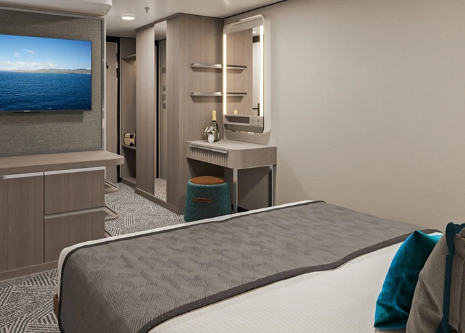 kúpeľna so sprchovacím kútom a WC, 2 lôžka (oddelené alebo spojené do manželského lôžka), v niektorých kajútách prístelok, toaletný stolík, úložné priestory, TV, trezor, telefon, fén na vlasy