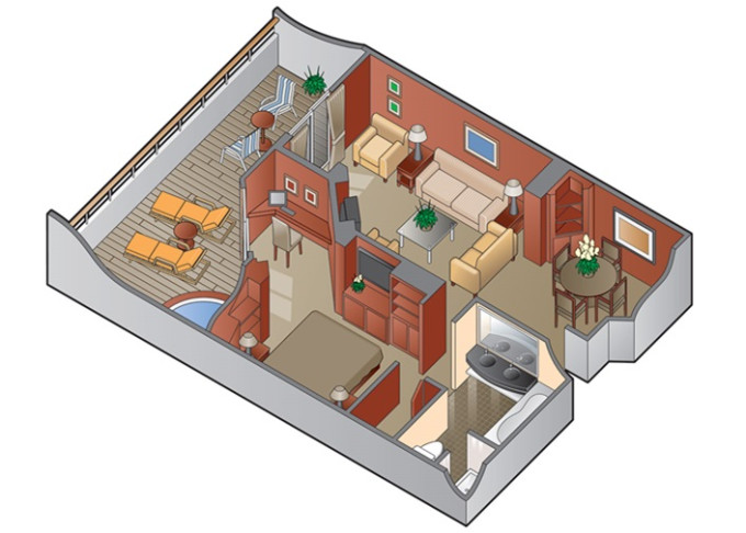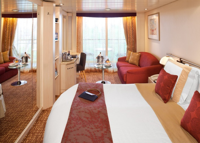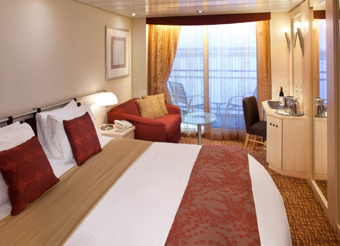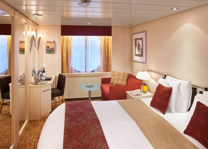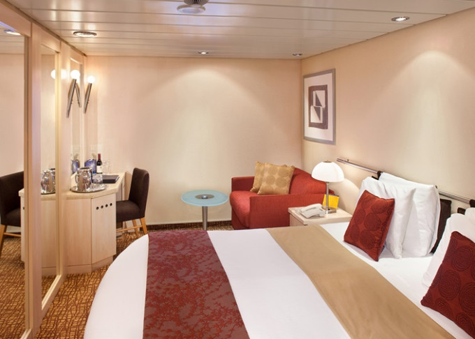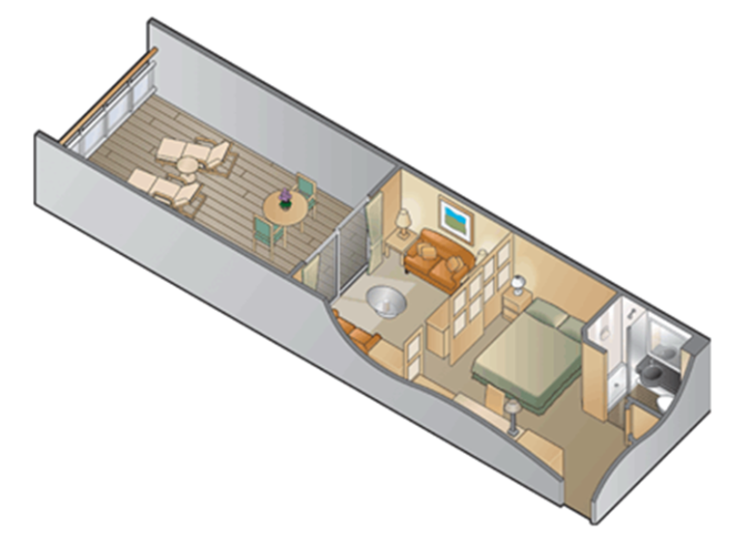- Kajuty sú umiestnené v blízkosti lodného Spa. K ich vybaveniu patrí posilnený systém vzdušnej filtrácie, posteľ Queen-Size (v kategóriách Edge King-Size), veľké zasúvacie sklenené dvere, exkluzívne posteľné prádlo eXhale®, veľkorysé skladovacie priestory.