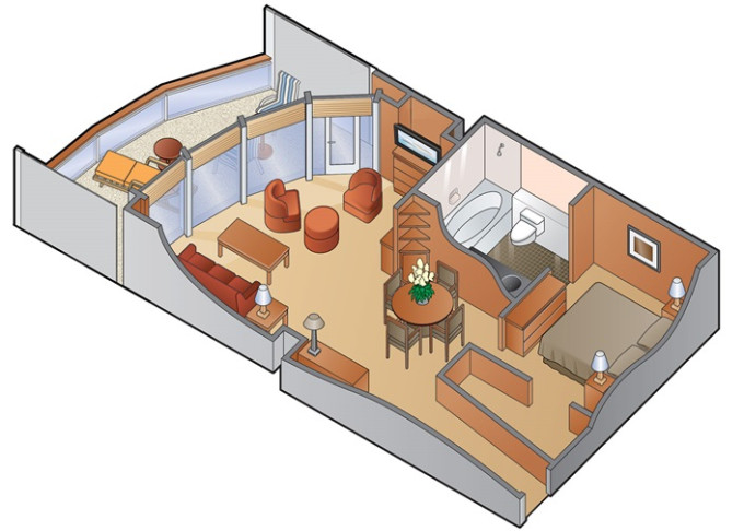 | CS - Celebrity Suite 44 m² + balkón 8 m². Kúpeľňa s vírivkou. 6. až 9. paluba. Max 3 osoby. Výhody Suite The Retreat. | 14 272 € 7 136 € za osobu | ||