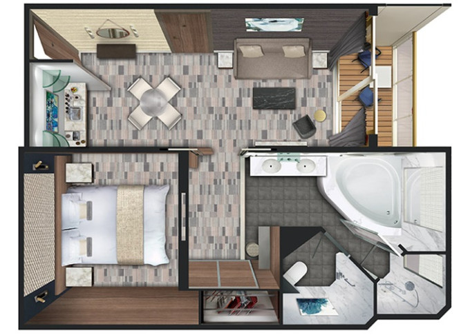 | SB - Aft-facing Owners Suite 56 m² / balkón 6 m². Vírivka. 9. paluba - vzadu. Max 2 osoby. Výhody Suite. | 34 112 € 17 056 € za osobu | ||