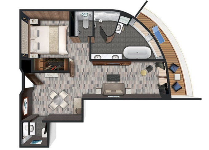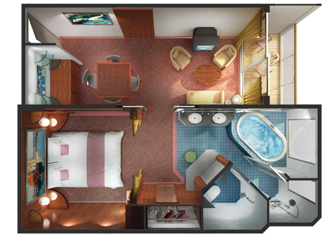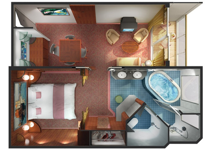 | SC - Forward-facing Deluxe Penthouse Suite 51 m² / balkón 10 m². Vírivka. 10. paluba - vpredu. Max 3 osoby. Výhody Suite. | 26 862 € 13 431 € za osobu | ||