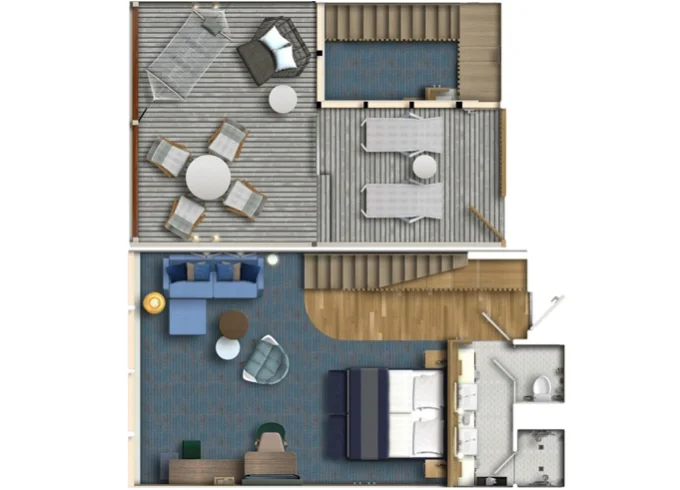 SUHO - Himmel & Meer Suite 42 m² + prekrytá terasa 29 m² na poschodí so stolom, ležadlami a s hojdacou sieťou. 14. paluba. Max 4 osoby. Výhody Suite. 18 256 € 4 564 € za osobu