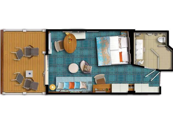 | VEPO - Kajuta s terasou Premium 17 m² + balkón 30 m² s 2 kreslami, 2 ležadlami a hojdacou sieťou. 7-11. paluba. Max 3 osoby. | 14 397 € 4 799 € za osobu | ||