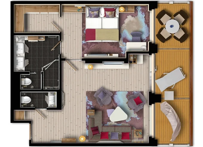 | SUTO - Themen Suite 54 m² + balkón 15 m² so stolom, ležadlom a hojdacou sieťou. Spálňa, obývacia časť, šatník. 10. paluba. Max 4 osoby. Výhody Suite. | 23 998 € 11 999 € za osobu |