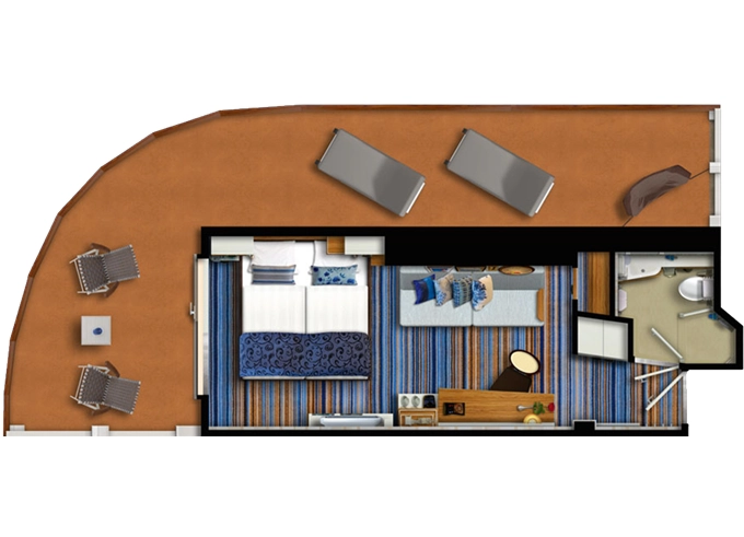 | SUTO - Themen Suite 54 m² + balkón 15 m² so stolom, ležadlom a hojdacou sieťou. Spálňa, obývacia časť, šatník. 10. paluba. Max 4 osoby. Výhody Suite. | 23 998 € 23 998 € za osobu |
